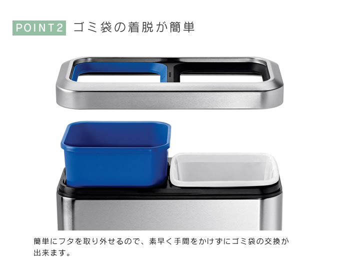 商品詳細 商品名シンプルヒューマン ゴミ箱 分別スリムオープンカン 20L CW1470 simplehuman シルバー ポイント簡単にフタを取り外せるので、素早く手間を掛けずにゴミ袋の交換ができます。